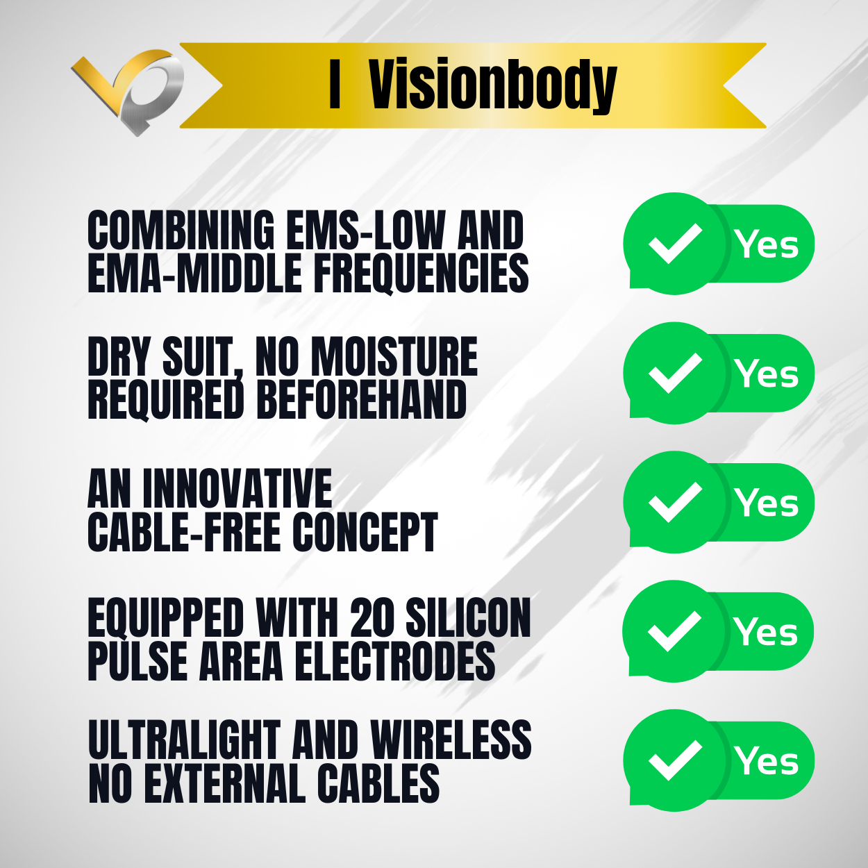 The Visionbody EMS Powersuit offers users a variety of potential benefits. When used correctly in combination with traditional training methods, users have reported stronger muscles, less back pain, a more toned body, a reduced appearance of cellulite and an improved sense of overall well-being.How often should I use the Visionbody EMS suit?