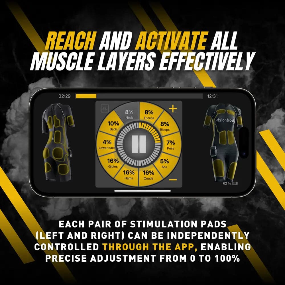 The Visionbody ULTIMATE EMS Powersuit has 12 channels to activate the muscles of most major muscle groups, to target 3 additional muscle groups and provide a true full body workout.